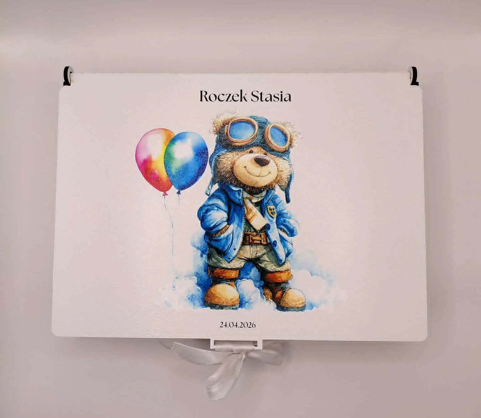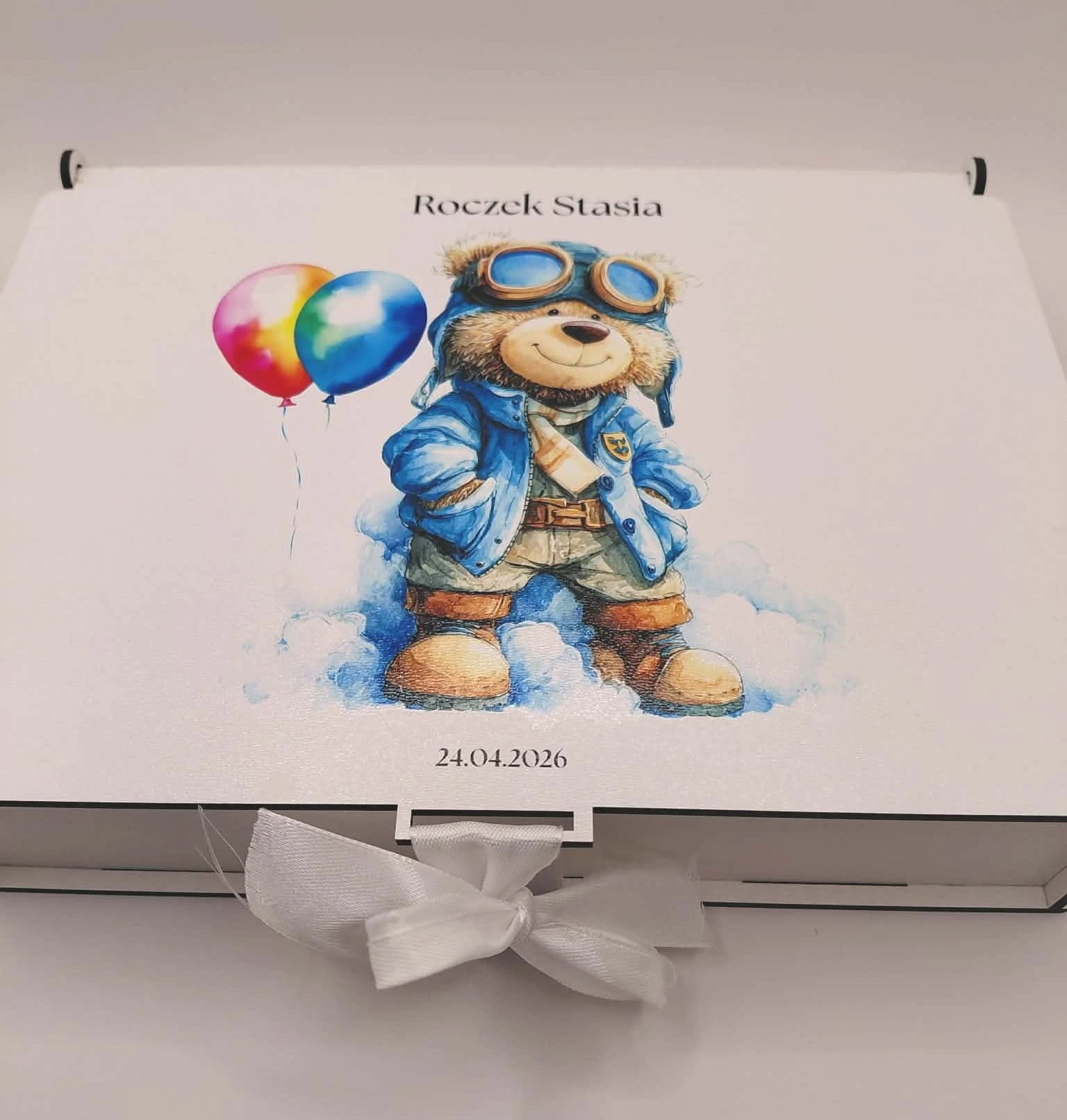 Wieczko zdobi wysokiej jakości grafika przedstawiająca misia w stylu lotnika z balonami oraz indywidualny napis (imię i data uroczystości). To sprawia, że pudełko staje się nie tylko opakowaniem, ale również wyjątkową pamiątką na długie lata.