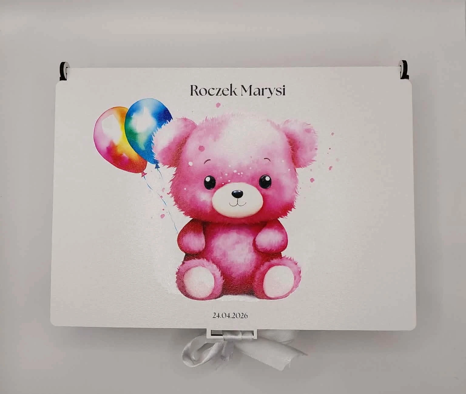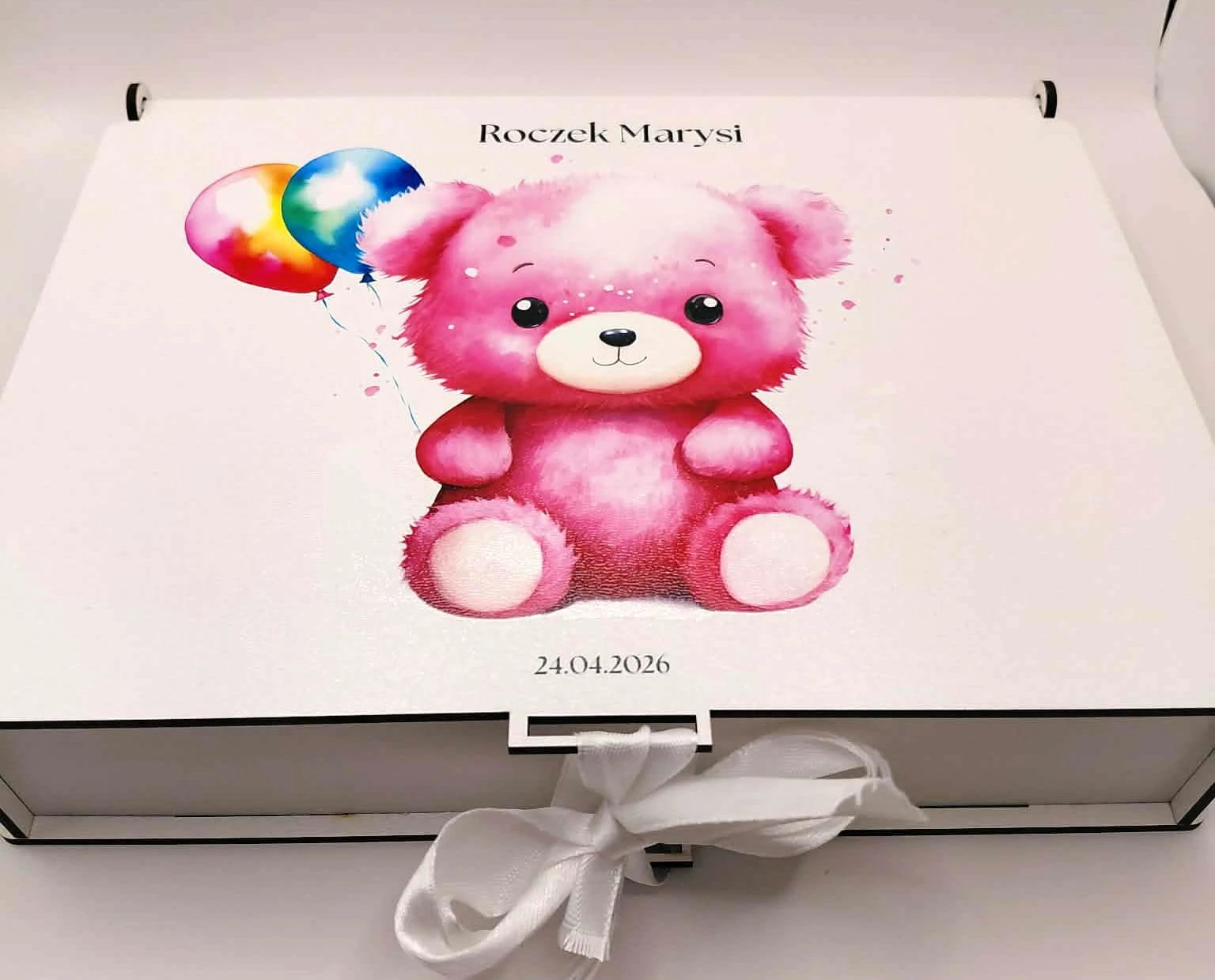 Na wieczku znajduje się wysokiej jakości nadruk – w tym przypadku uroczy motyw misia z balonami oraz imię i data uroczystości. Dzięki temu pudełko staje się nie tylko opakowaniem, ale również piękną pamiątką na lata.