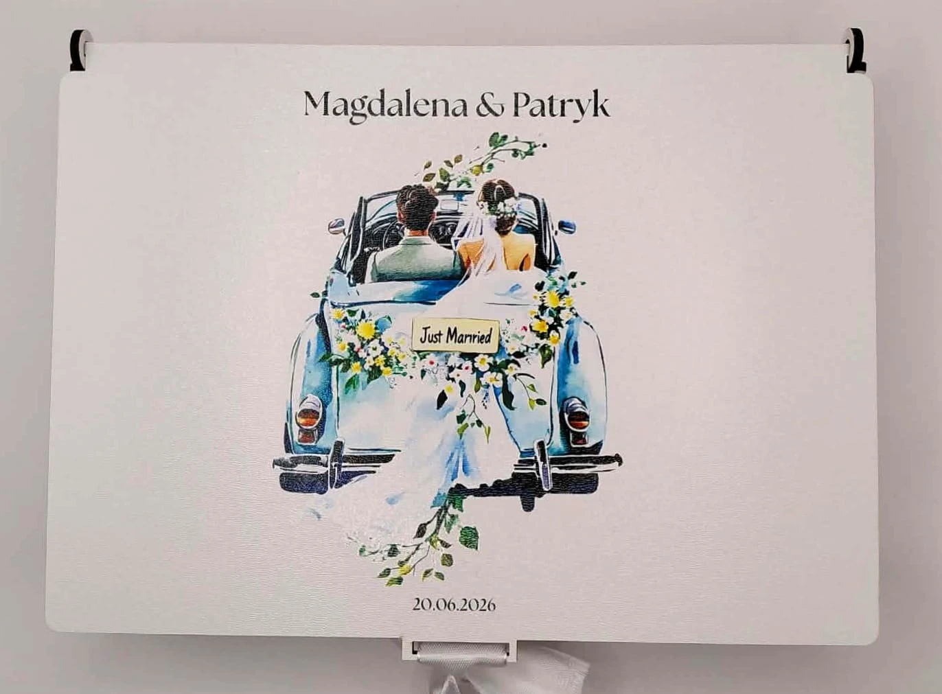Wieczko może zostać ozdobione indywidualnym nadrukiem – imionami, datą lub grafiką (np. motywem ślubnym „Just Married”). Dzięki temu pudełko staje się unikalną pamiątką na lata.