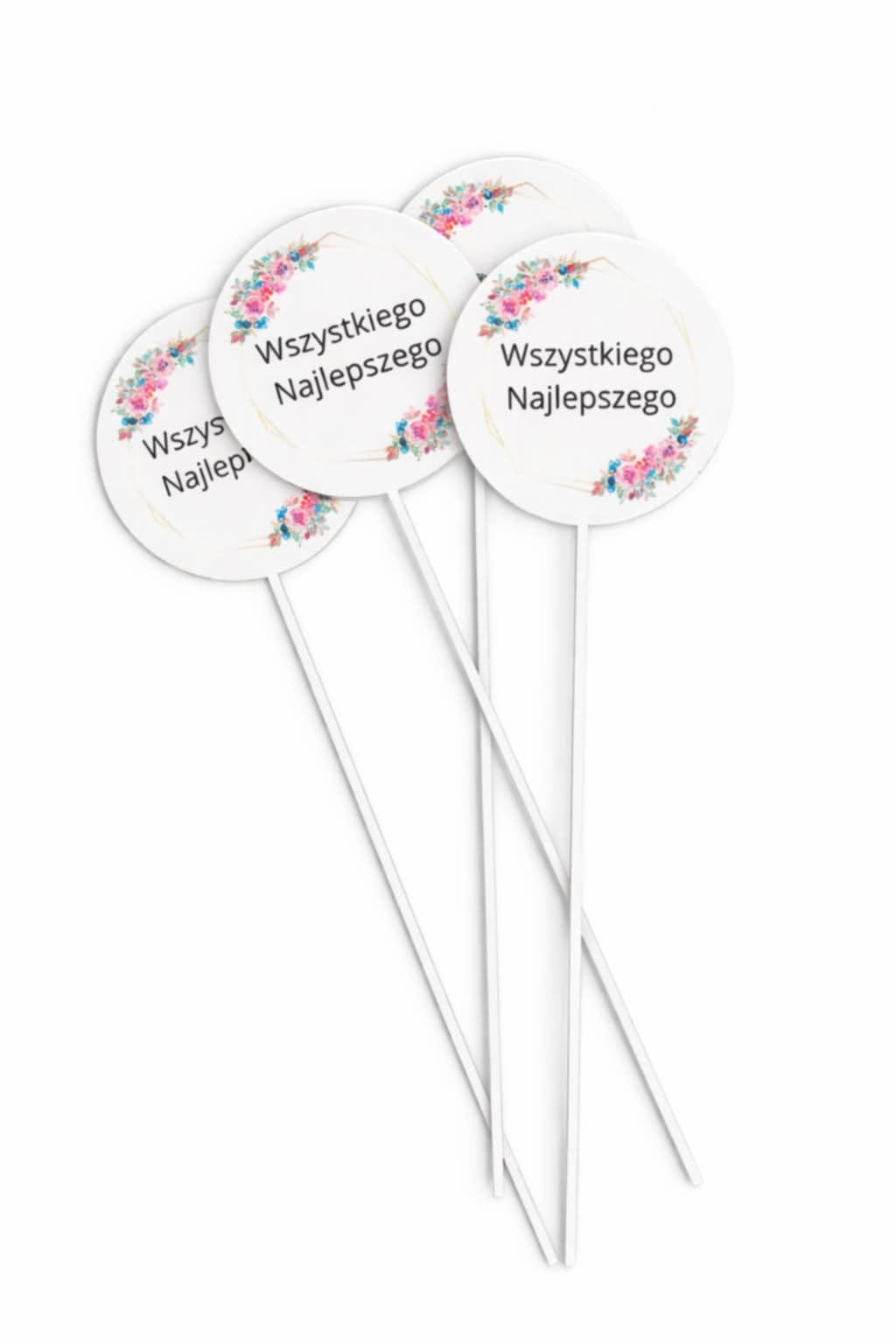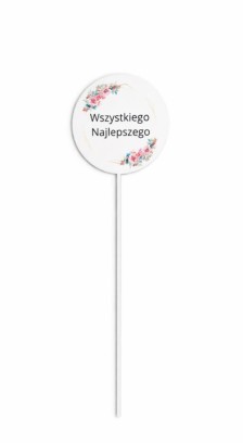 Stylowa dekoracja na patyku z napisem „Wszystkiego Najlepszego”, ozdobiona delikatnym, kwiatowym motywem w pastelowych kolorach. Elegancka i uniwersalna forma sprawia, że topper doskonale nadaje się jako dodatek do bukietów kwiatów, flower boxów, prezentów oraz dekoracji okolicznościowych.